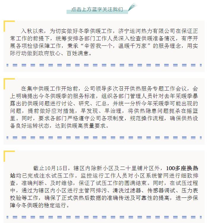 | 上一條:濟(jì)寧運(yùn)河熱力有限公司第三批小區(qū)試壓通知 | 下一條:濟(jì)寧城區(qū)新增供熱小區(qū)2809戶居民,今冬有望用上暖氣 |